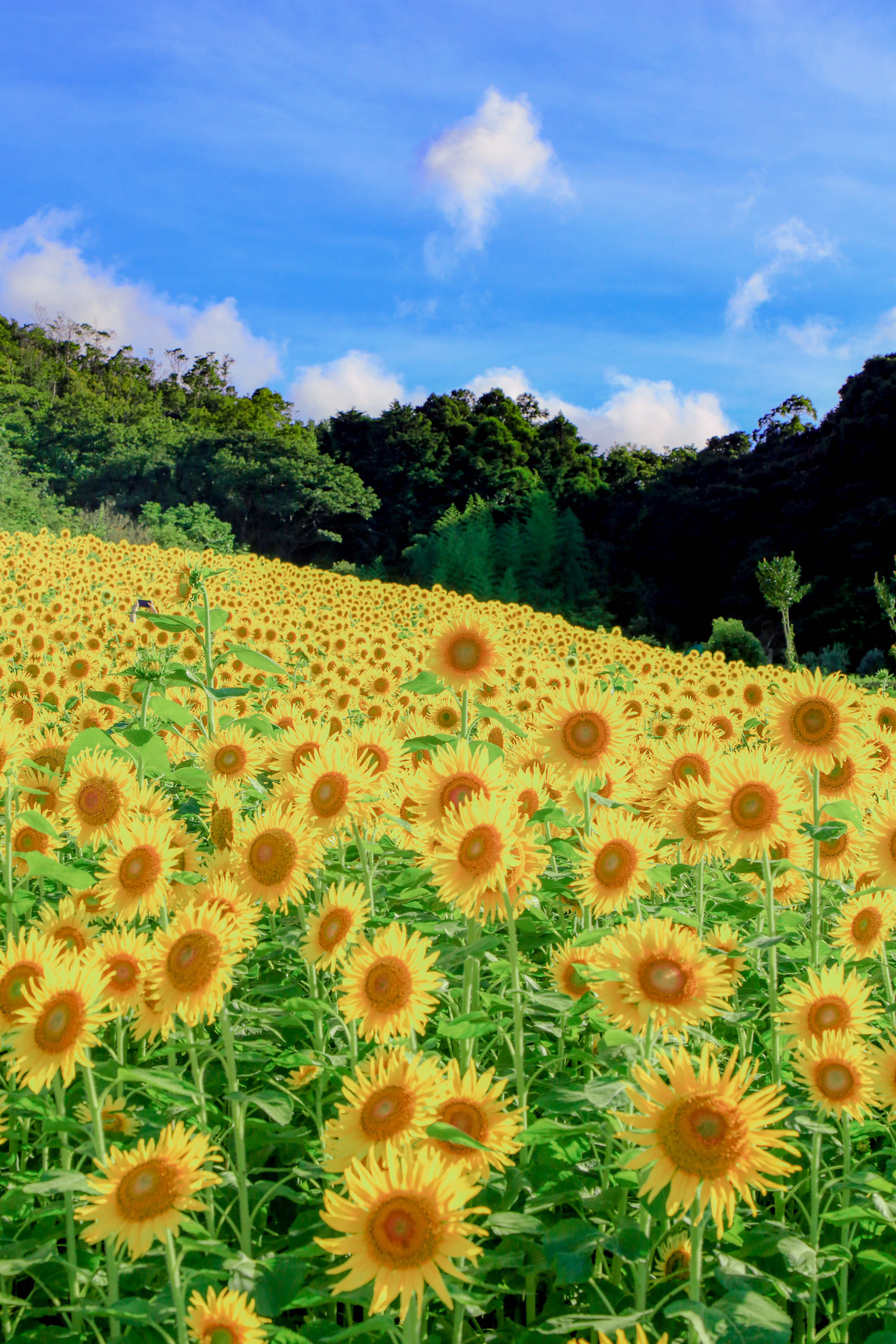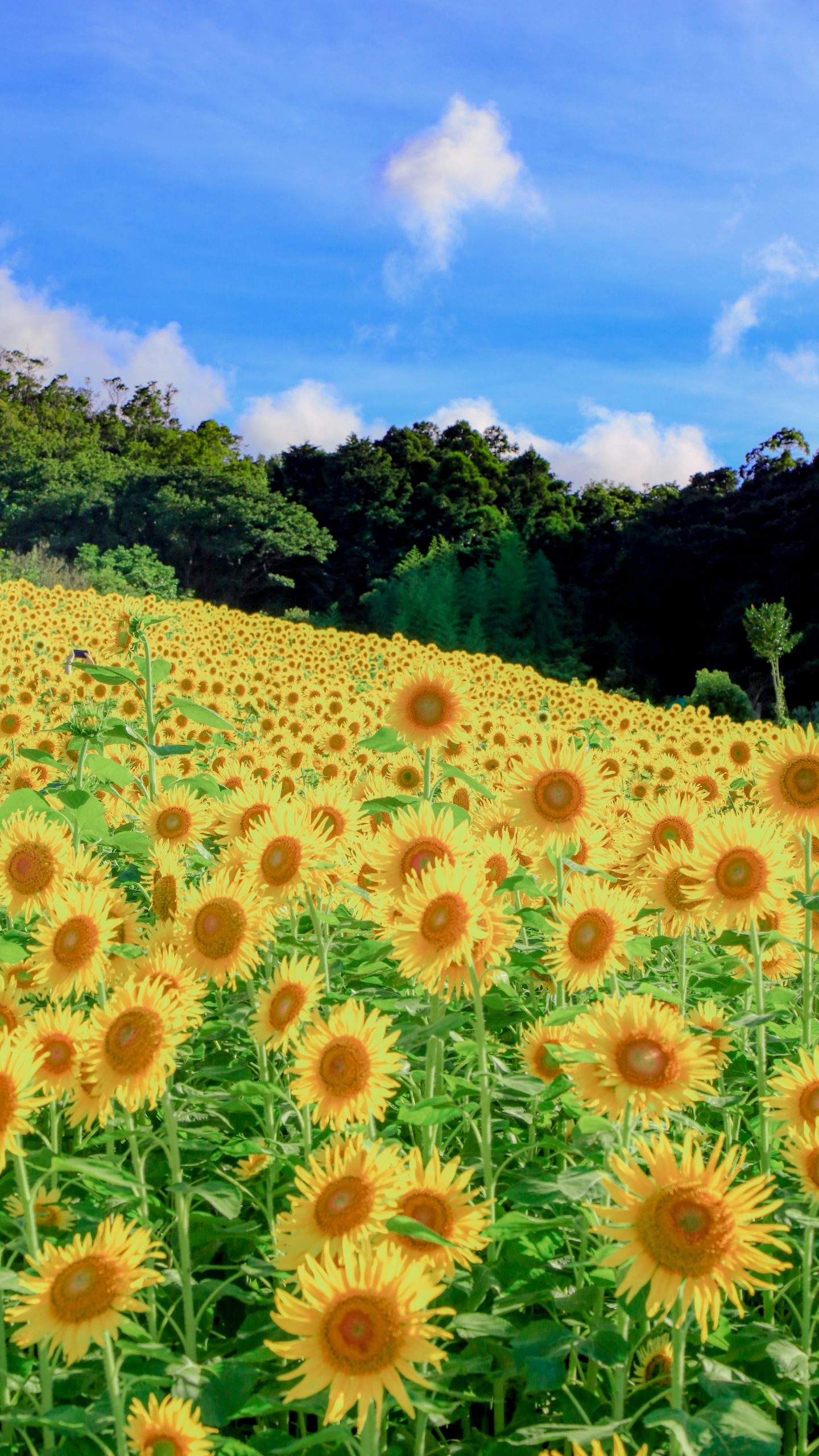 無料スマホ壁紙「ひまわりの丘」はiPhone・Androidに対応した縦長の高画質な待ち受けです。三重県の志摩市観光農園でふがまるちゃんが撮影した写真です。今月のカレンダーを合成や開運数字を追加するカスタマイズも可能です。商用利用OKのフリー写真素材ですが、利用規約を守ってご利用ください。