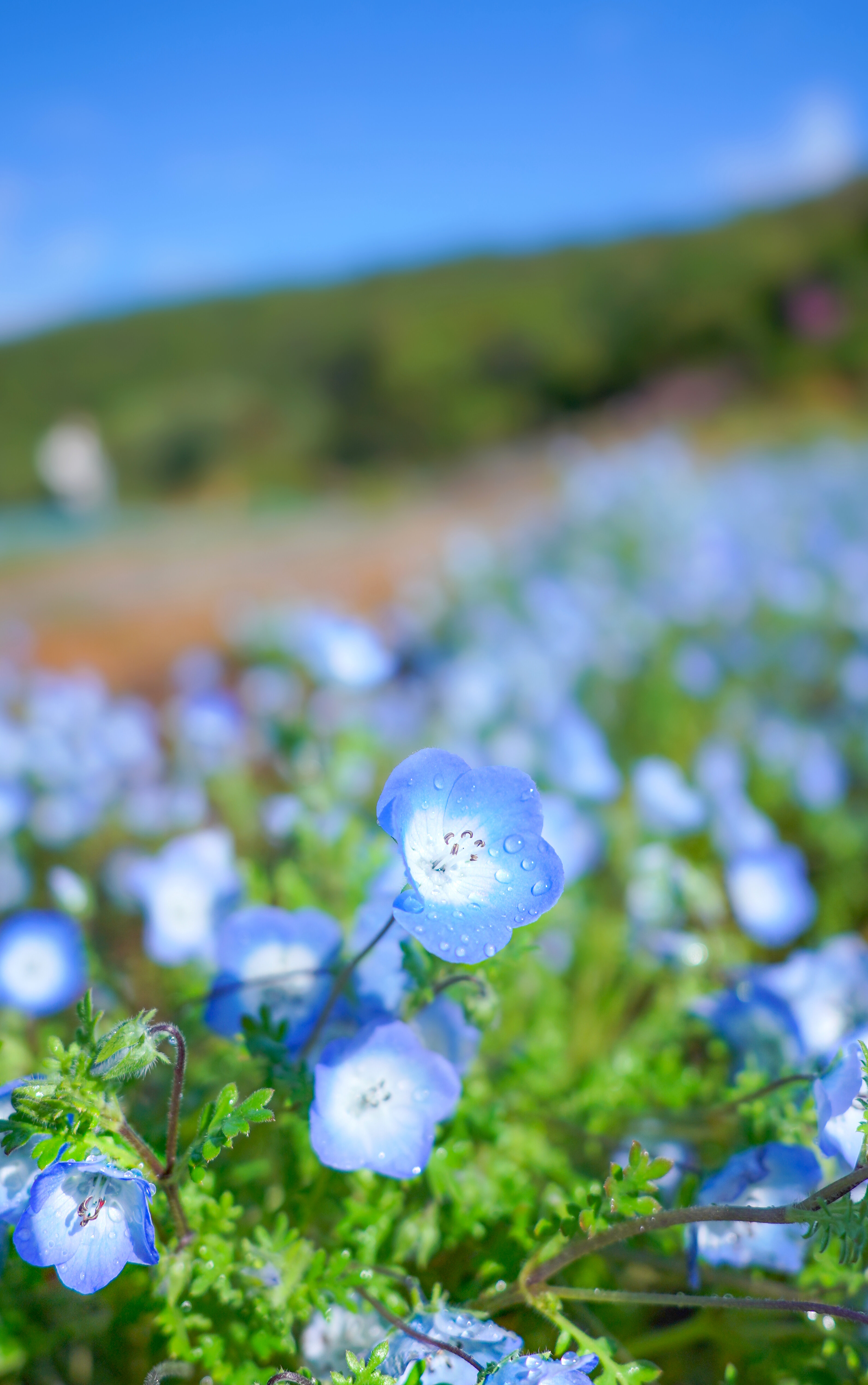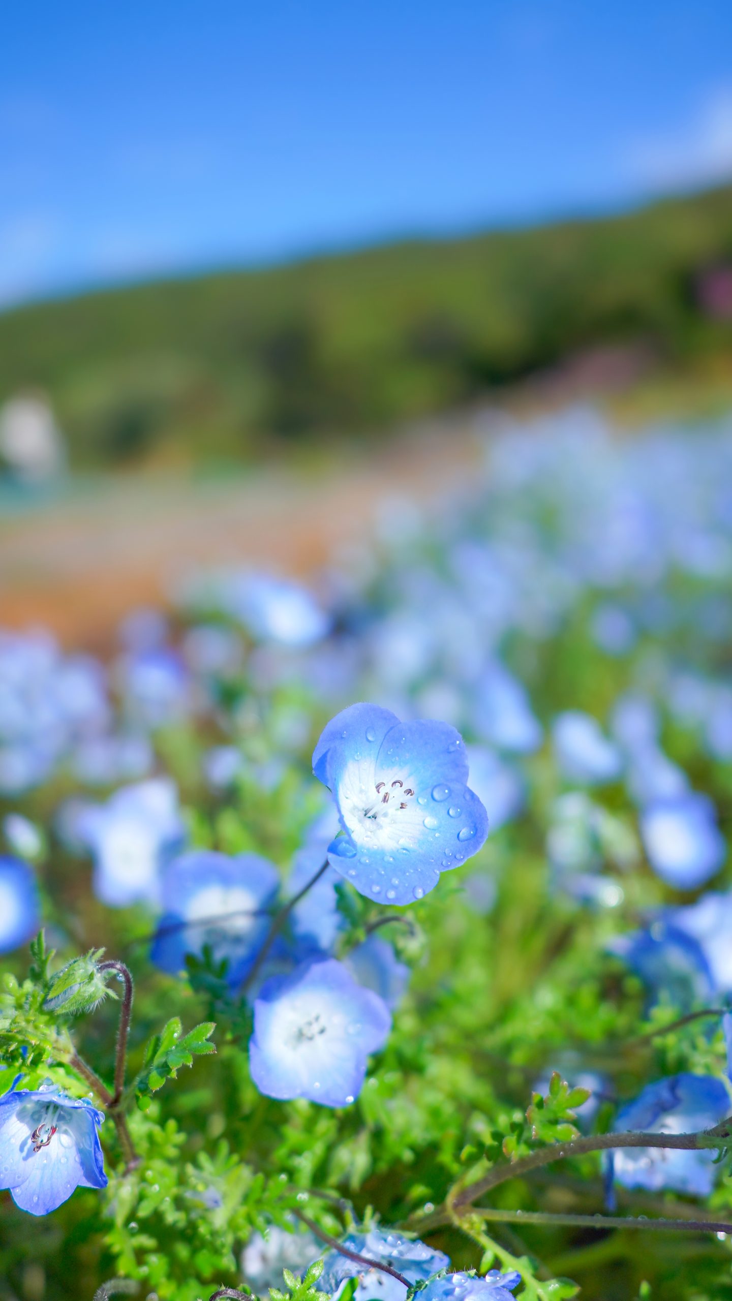 無料スマホ壁紙「雨上がりのネモフィラ畑」はiPhone・Androidに対応した縦長の高画質な待ち受けです。三重県の志摩市観光農園でふがまるちゃんが撮影した写真です。今月のカレンダーを合成や開運数字を追加するカスタマイズも可能です。商用利用OKのフリー写真素材ですが、利用規約を守ってご利用ください。