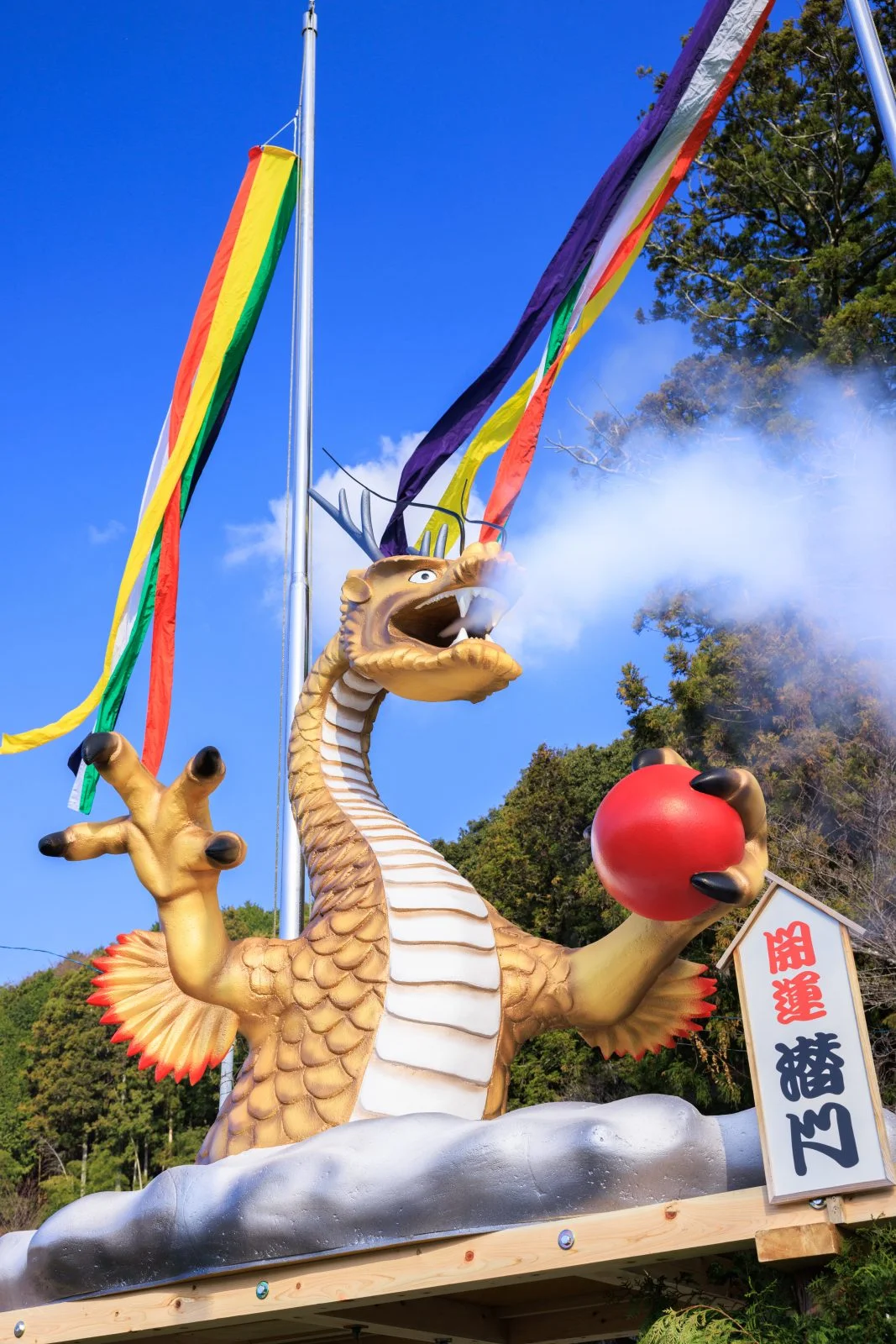 無料スマホ壁紙「青空の下で煙を噴き出す辰のジャンボ干支」はiPhone・Androidに対応した縦長の高画質な待ち受けです。三重県の辰水神社のジャンボ干支でふがまるちゃんが撮影した写真です。今月のカレンダーを合成や開運数字を追加するカスタマイズも可能です。商用利用OKのフリー写真素材ですが、利用規約を守ってご利用ください。