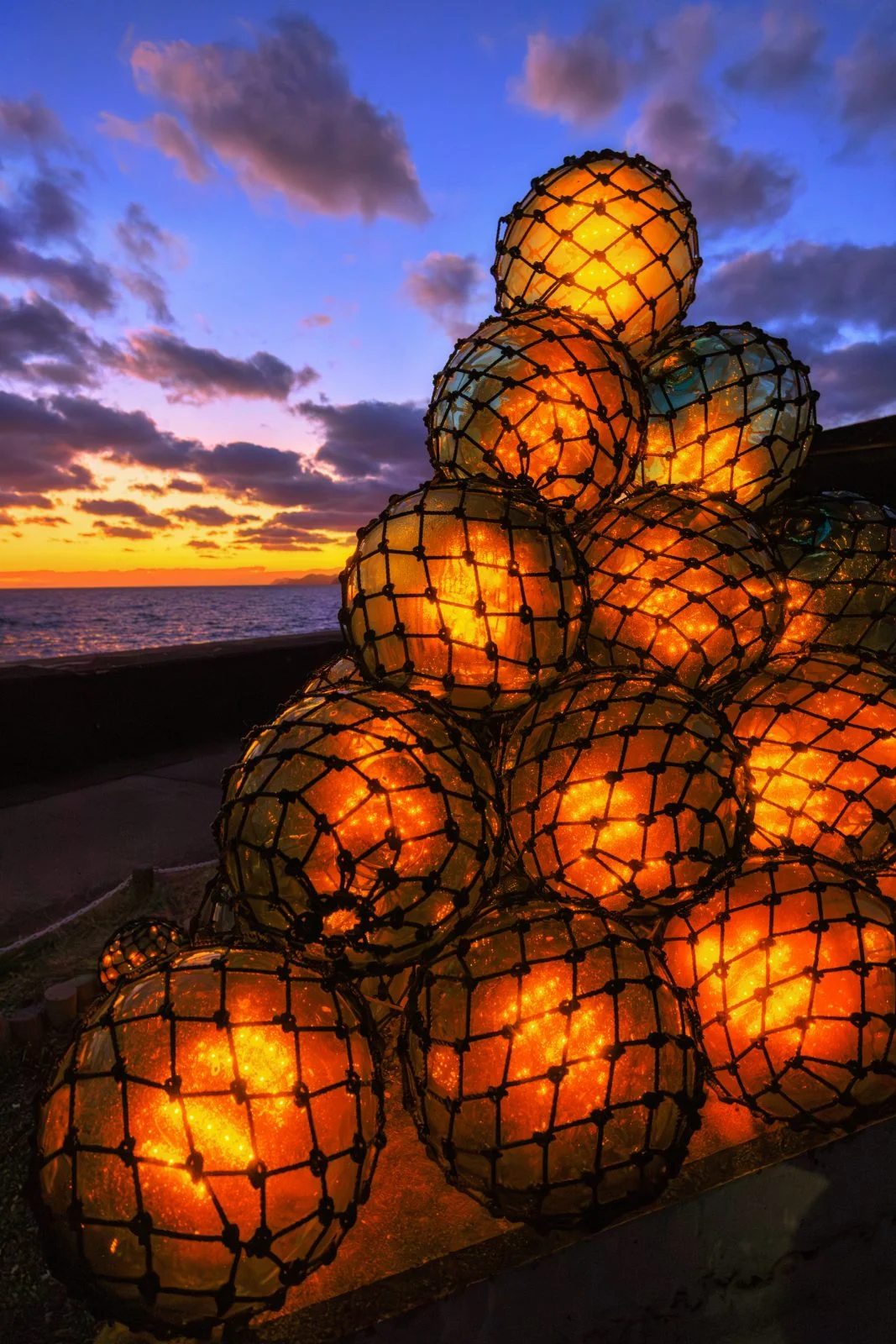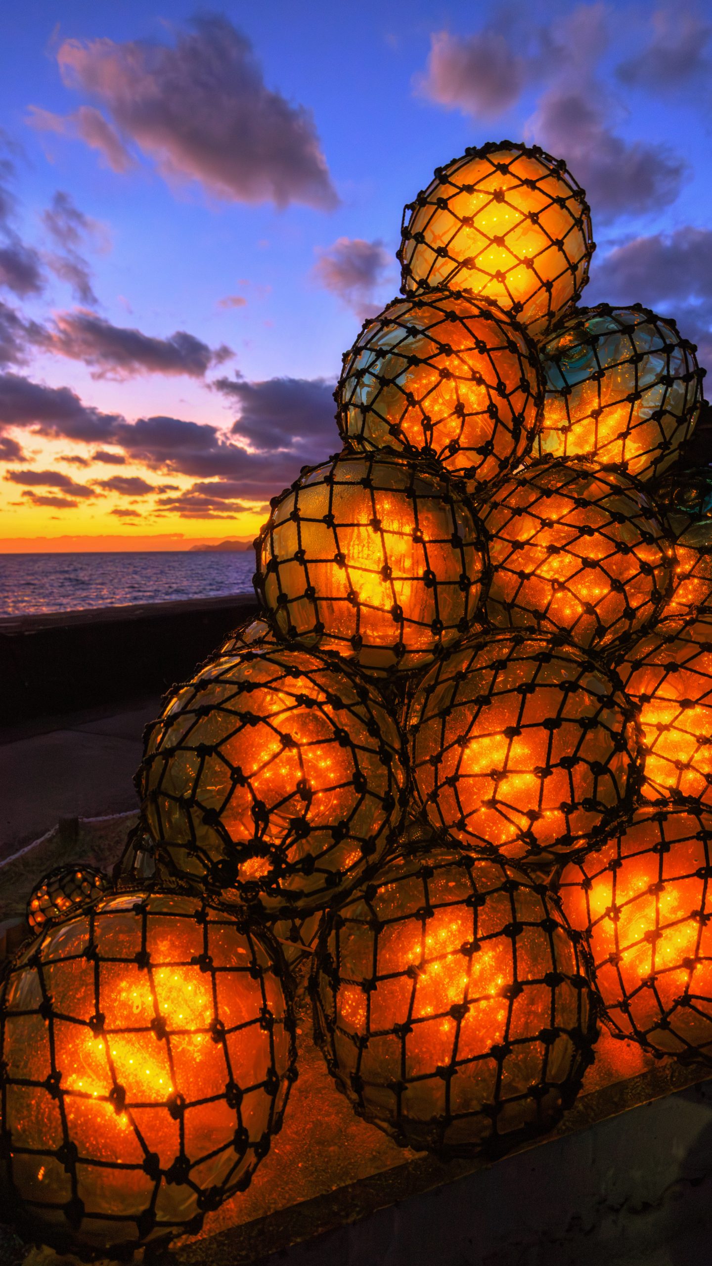無料スマホ壁紙「夕焼けとビン玉」はiPhone・Androidに対応した縦長の高画質な待ち受けです。三重県のビン玉ロードでふがまるちゃんが撮影した写真です。今月のカレンダーを合成や開運数字を追加するカスタマイズも可能です。商用利用OKのフリー写真素材ですが、利用規約を守ってご利用ください。