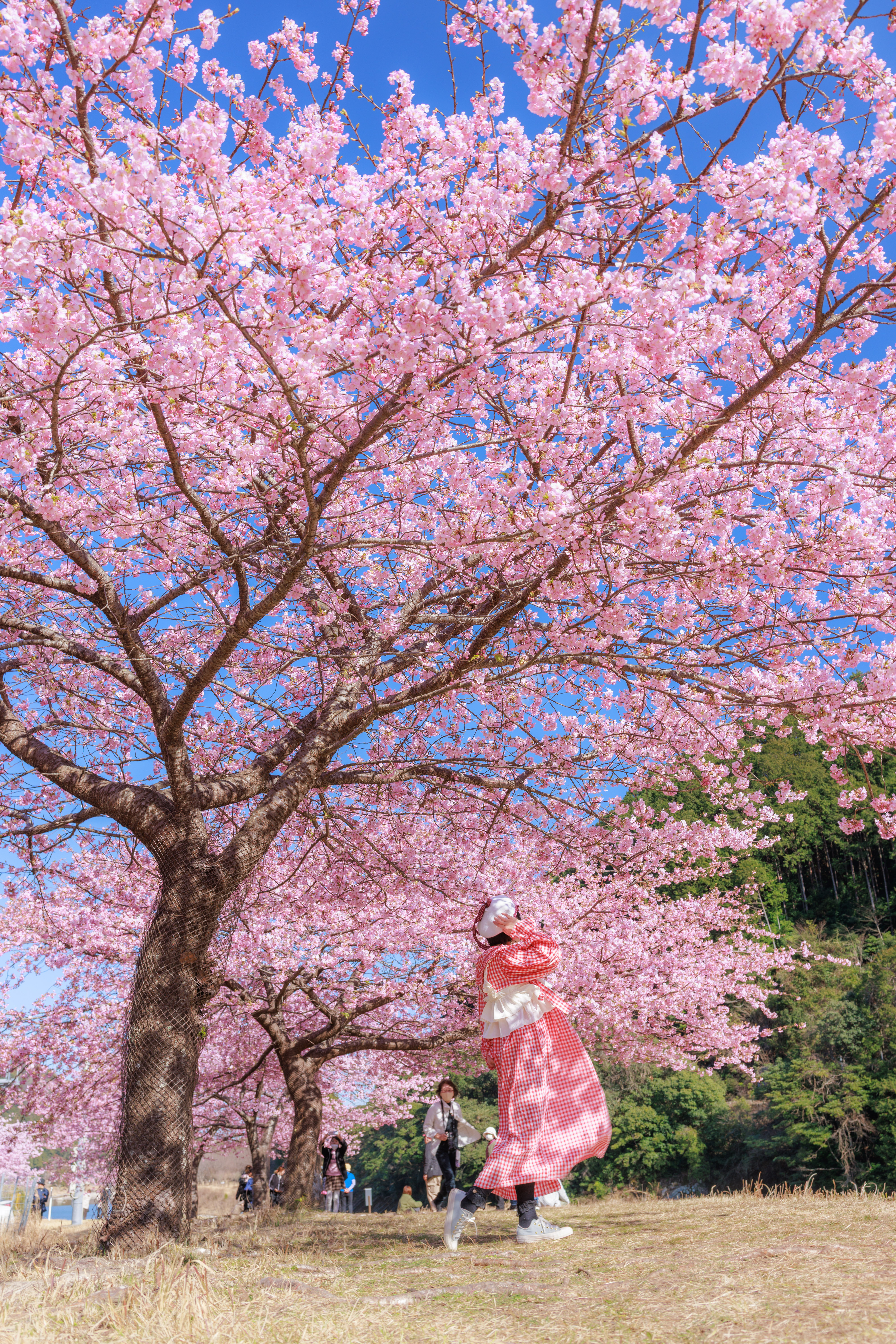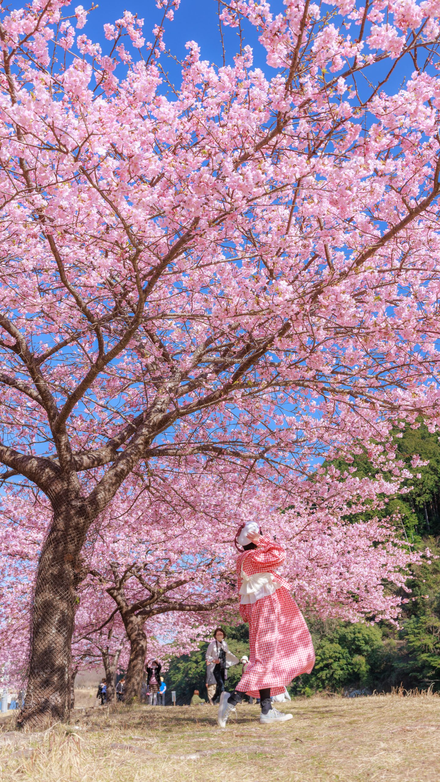 無料スマホ壁紙「チェックの衣装でお花見」はiPhone・Androidに対応した縦長の高画質な待ち受けです。三重県の種まき権兵衛の里の河津桜でふがまるちゃんが撮影した写真です。今月のカレンダーを合成や開運数字を追加するカスタマイズも可能です。商用利用OKのフリー写真素材ですが、利用規約を守ってご利用ください。