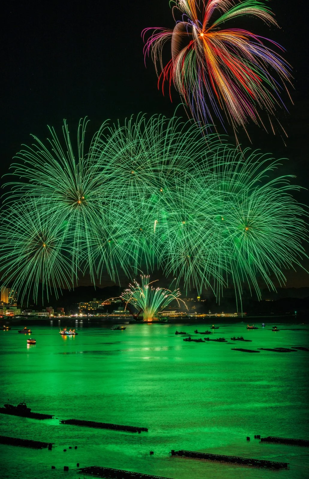 無料スマホ壁紙「緑色の花火に染まる鳥羽湾」はiPhone・Androidに対応した縦長の高画質な待ち受けです。三重県の鳥羽みなとまつりでふがまるちゃんが撮影した写真です。今月のカレンダーを合成や開運数字を追加するカスタマイズも可能です。商用利用OKのフリー写真素材ですが、利用規約を守ってご利用ください。