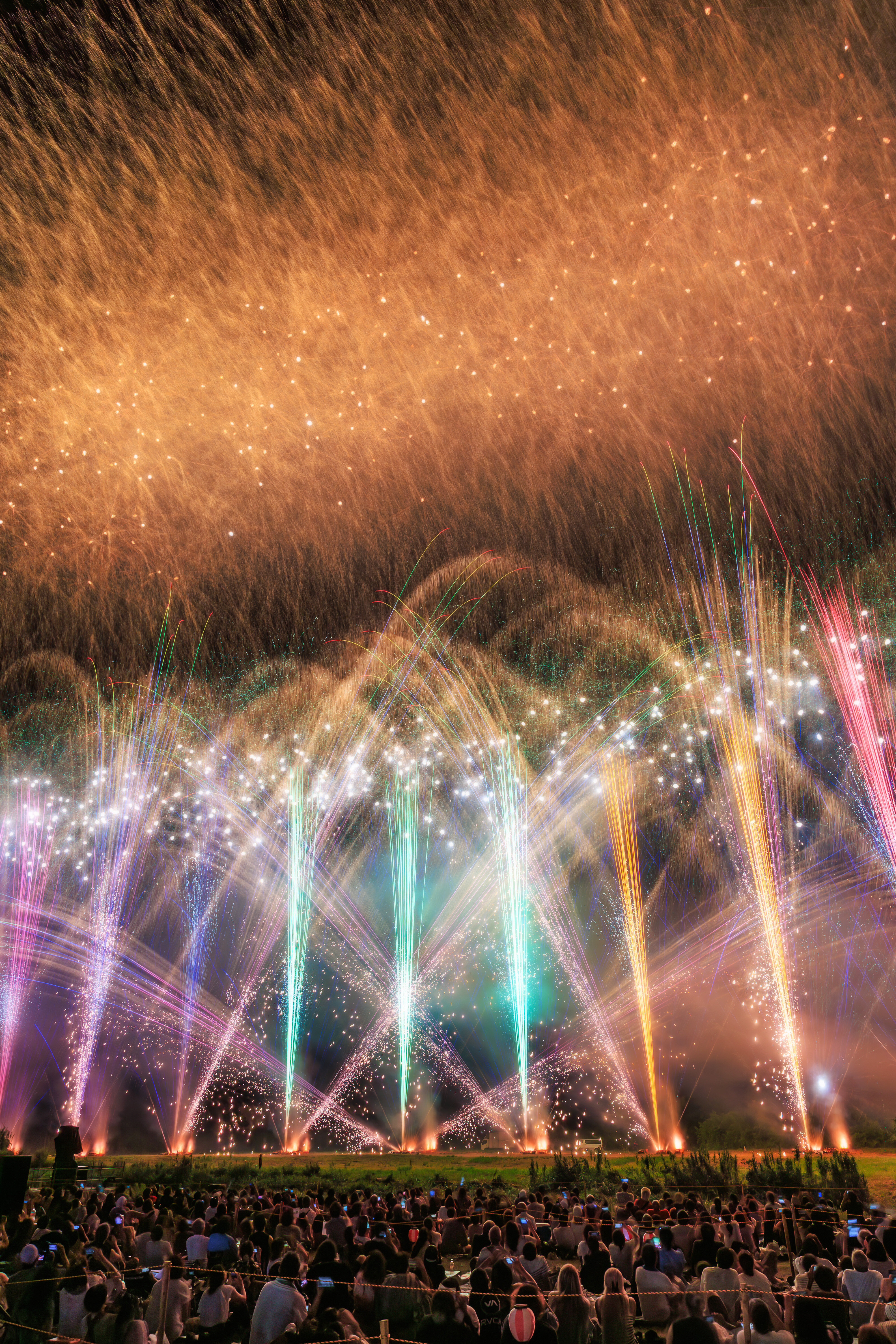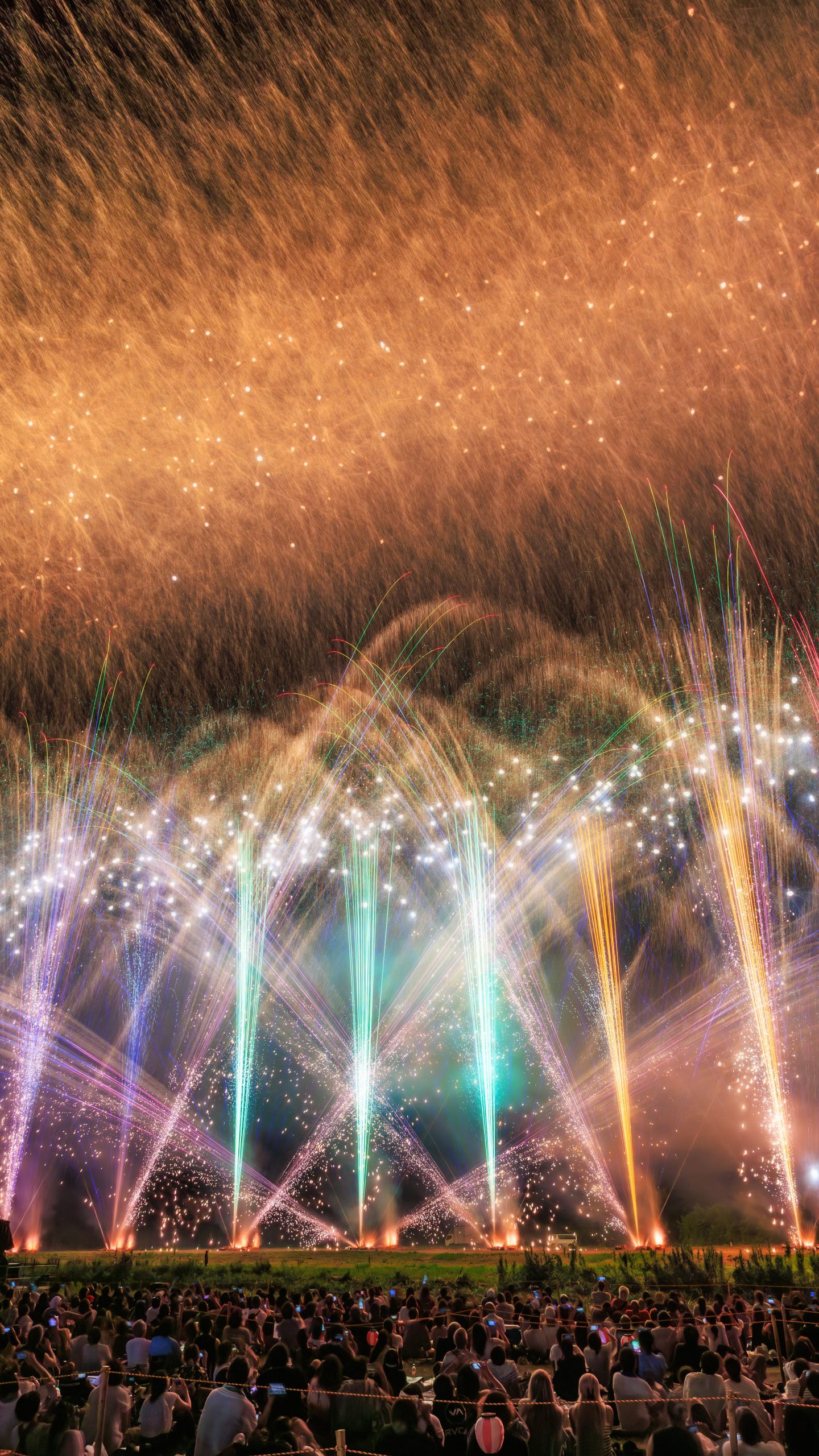 無料スマホ壁紙「虹色の花火に圧倒される観客」はiPhone・Androidに対応した縦長の高画質な待ち受けです。三重県の亀山市関宿納涼花火大会でふがまるちゃんが撮影した写真です。今月のカレンダーを合成や開運数字を追加するカスタマイズも可能です。商用利用OKのフリー写真素材ですが、利用規約を守ってご利用ください。