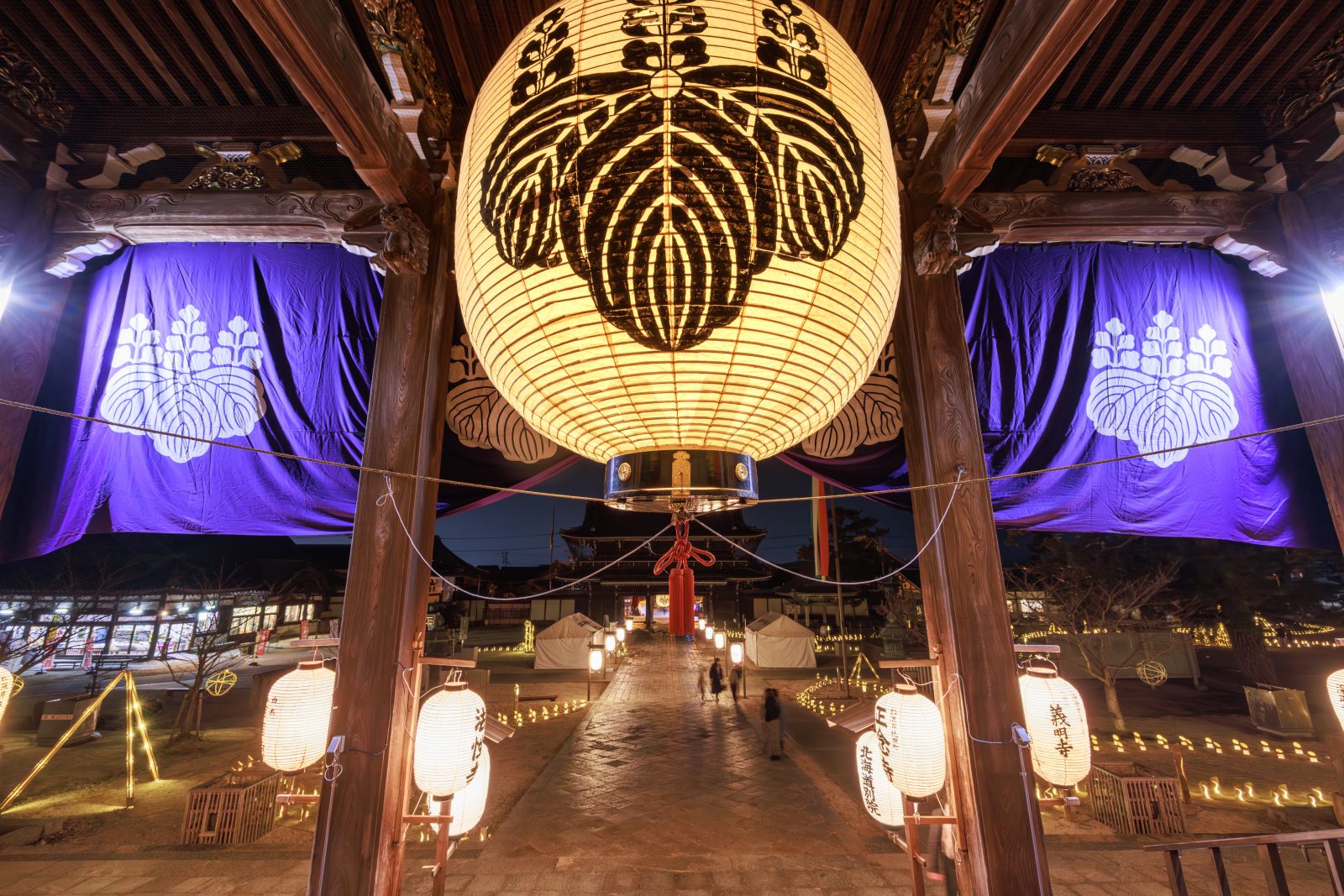 御影堂の入口近くには大型の提灯が吊るされており、この時期しか見られない光景です。