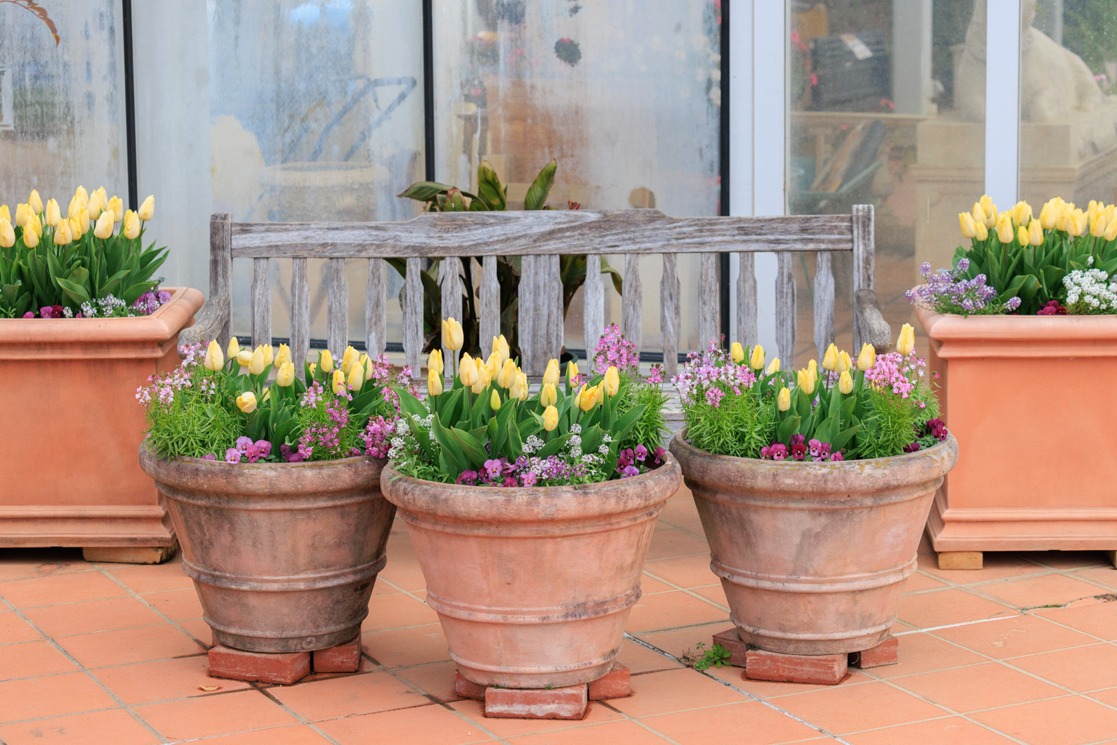 黄色いチューリップの植木鉢に囲まれたベンチは、記念撮影にもピッタリ 📸