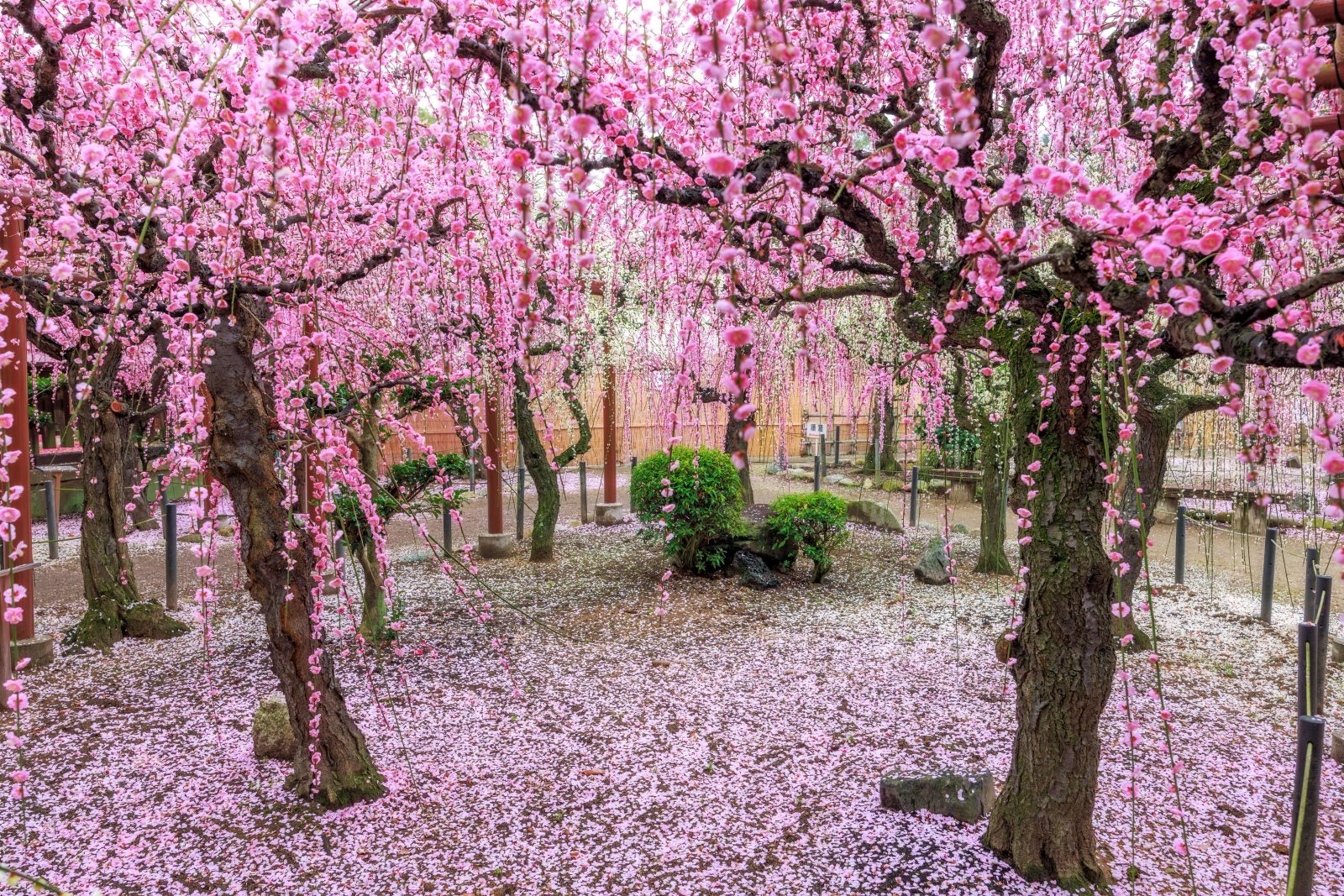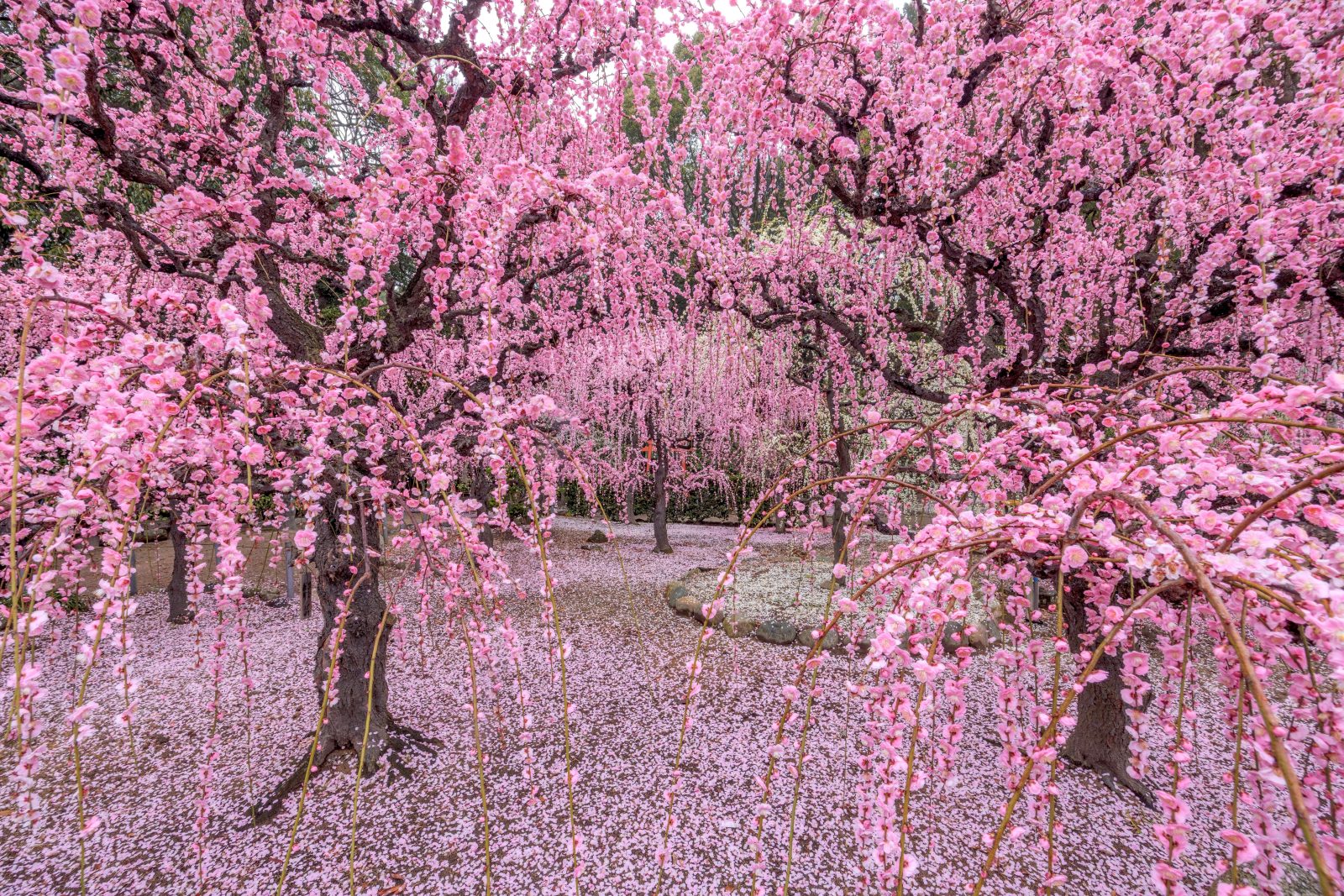 結城神社のしだれ梅は、見頃過ぎになると地面に花びらが積もり、梅のじゅうたんが出現!
